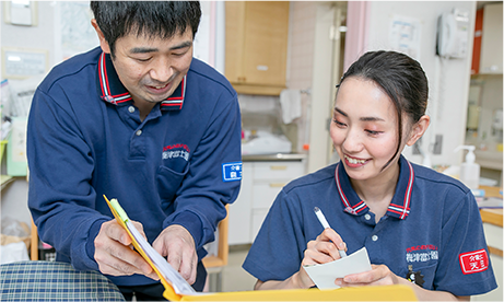 ①施設方針研修、②人間成長研修、③現場技術・知識研修です。教育は万全ですので、安心してきてもらっています。