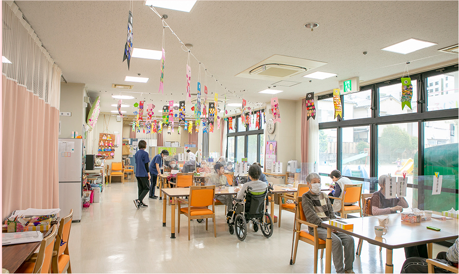 デイサービスセンターは、入浴・食事・健康状態のチェックのほか、様々なレクリエーションや体操、機能訓練指導員によるご利用者一人ひとりに合ったリハビリなどを実施しています。ご自宅でも気軽に実践できるトレーニングもレクチャーするなど、日常生活にも役立つサービスをご提供いたします。また、窓越しに保育園の園庭が見えるように設計された当施設では、園庭で遊ぶ子どもたちがご利用者に声をかけるなど、自然なコミュニケーションが生まれる機会も多く、世代を越えた交流も広がっています。 1日定員:30名